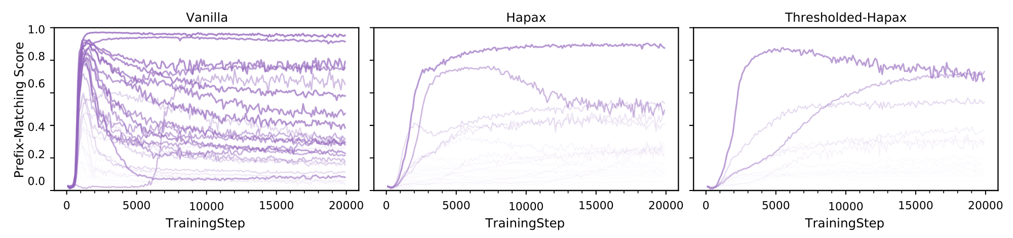 In the vanilla model, the top 10 prefix-matching heads achieve an average score of 61%, whereas in HAPAX this average drops to 40% and 36% for Thresholded-HAPAX. We observe that the vanilla model contains many heads whose prefix-matching scores spike early in training and then decay, while the Hapax variants show fewer rise-then-decay trajectories and fewer heads that ever reach high prefix-matching scores.