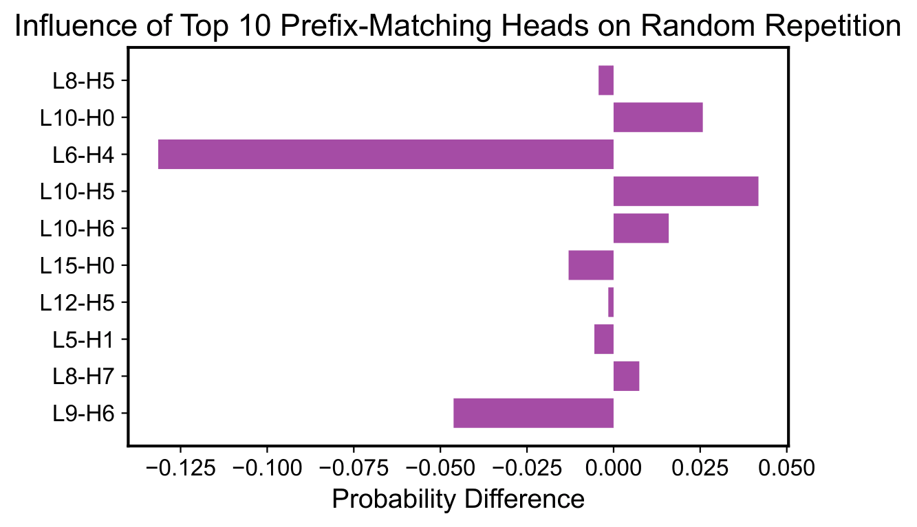 Using ablation studies, we analyze the causal impact of each individual attention head. We observe that out of the top 10 prefix matching heads, 6 of the heads negatively influence the probability assigned to the correct token, meaning that they functionally behave closer to an anti-induction head. Despite many of the top 10 prefix-matching heads negatively influencing prediction, abstractive ICL capabilities remain intact. This suggests that learning abstractive ICL is robust against the suppression of inductive copying.