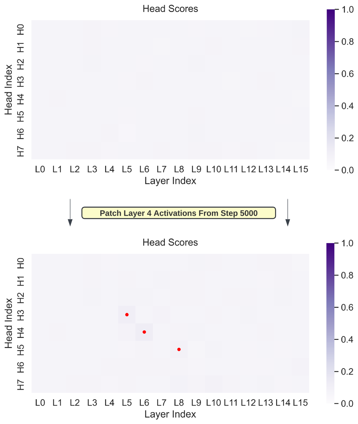 Notes: The authors use clamping to study subcomponents of induction circuits and their effect on phase changes. Using an optogenetics-inspired causal framework, they identify three underlying subcircuits that interact to drive induction head formation.