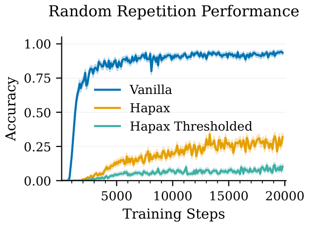 We first measure random repetition performance: the model is given 1000 sequences of random repeated tokens r1r2...rsr1r2...rs-1 and is expected to predict rs. This synthetic task does not occur in natural language but is solvable through induction heads. The HAPAX model experiences a 66% drop and Thresholded-HAPAX experiences an 89% drop in accuracy relative to the vanilla model at the end of training.