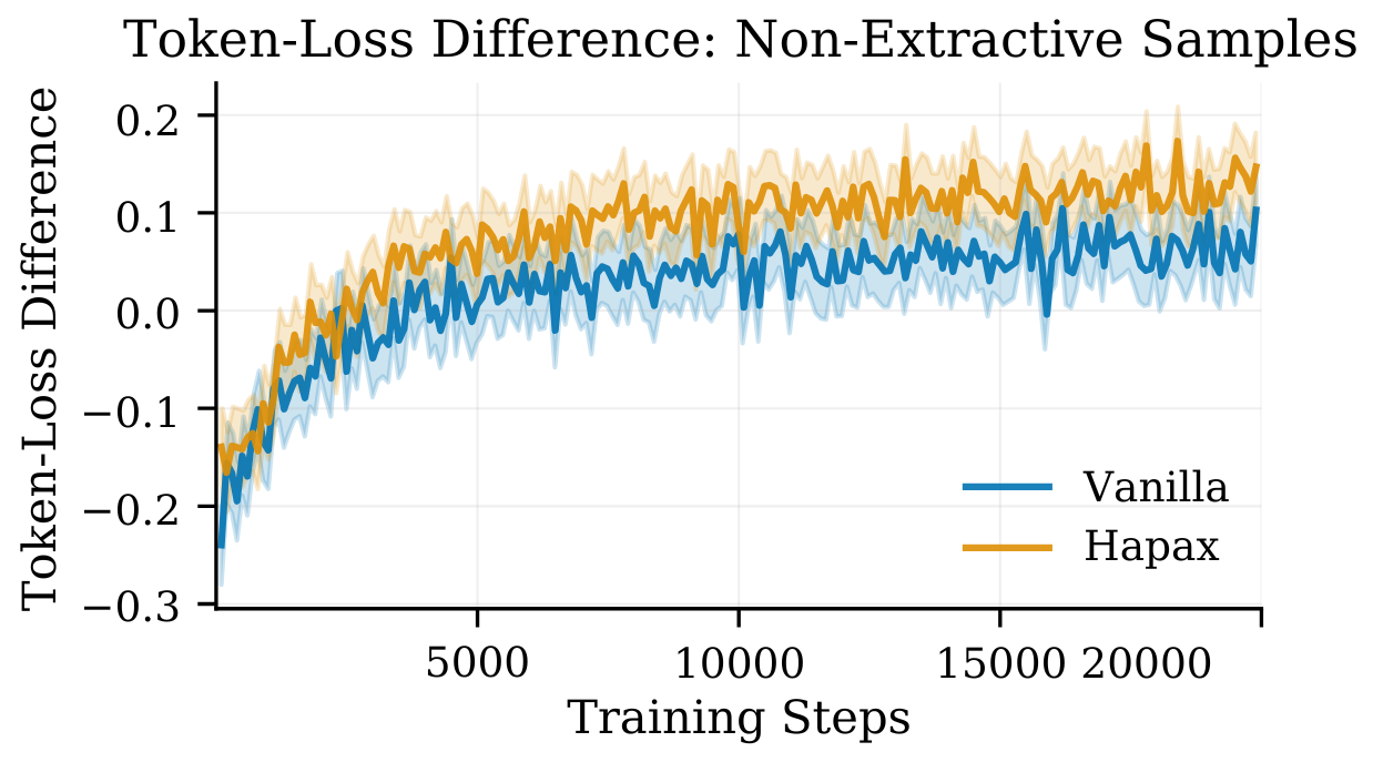 To investigate this hypothesis further, we propose using samples where neither the 500th nor the 50th token can be predicted correctly with inductive copying. With this modification, we observe that, contrary to the regular token-loss difference metric, the HAPAX model has a slightly higher token-loss difference, which suggests that it can leverage context better for non-exact copying instances. We also observe that the model's ability to leverage context for non-exact matching tokens does not exhibit a phase shift but rather improves gradually across training steps.